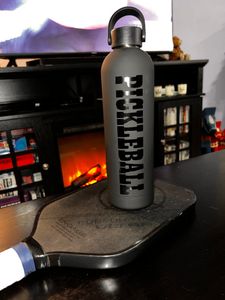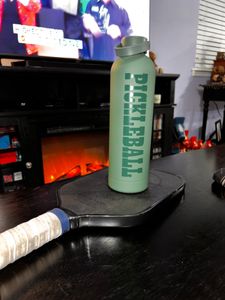 Stay hydrated on the court with help from this beautiful stainless steel water bottle! This bottle has a skinny body with a lovely matte finish & sleek "Pickleball" design on it. Attached to the cap is an arched handle that allows you to easily take this water bottle on-the-go.